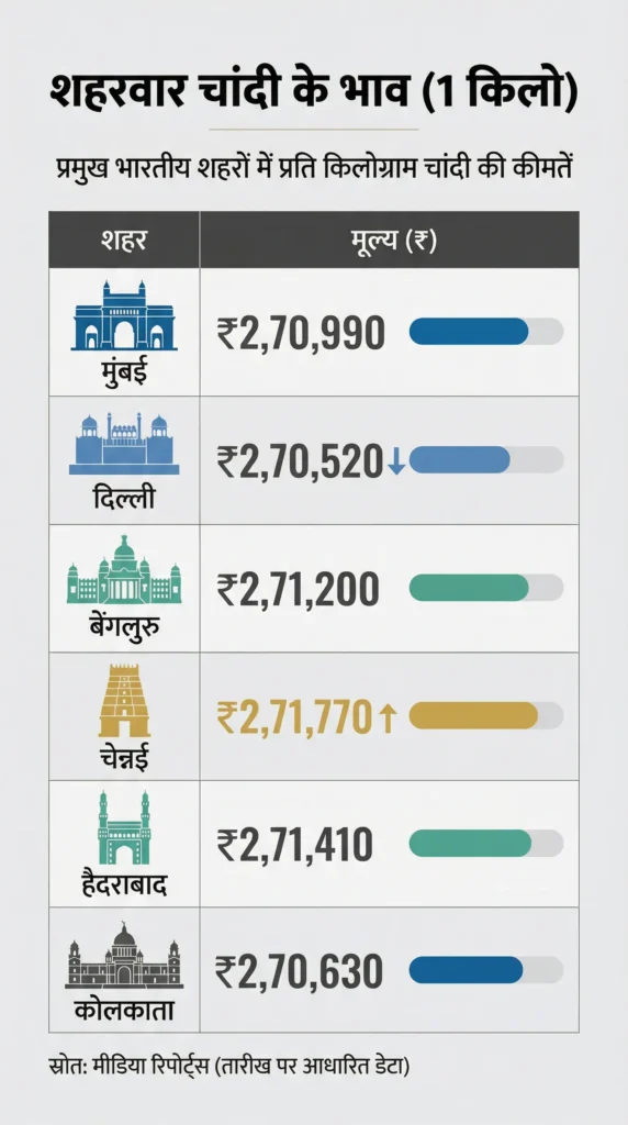 • चांदी: हाल ही में भारी गिरावट के बाद आज कुछ सुधार दिखा, लेकिन कई शहरों में भाव ₹20,000 प्रति किलो तक नीचे आए हैं। अंतरराष्ट्रीय बाजार में चांदी 90 डॉलर प्रति औंस से ऊपर ट्रेड कर रही है।