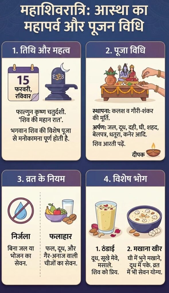 तारीख – इस साल महाशिवरात्रि का पर्व 15 फरवरी 2026 (रविवार) को मनाया जाएगा। हिंदू पंचांग के अनुसार, यह पर्व फाल्गुन मास के कृष्ण पक्ष की चतुर्दशी को पड़ता है। व्रत कैसे करें कई भक्त निर्जला व्रत रखते हैं (पानी और भोजन का सेवन नहीं)। अधिकांश लोग फल, दूध और व्रत में मान्य सब्जियां खाते हैं। दिनभर शिवजी की पूजा और रातभर जागरण का महत्व है। महाशिवरात्रि भोग रेसिपीज ठंडाई भगवान शिव को प्रिय भोग। सामग्री: दूध, चीनी, बादाम, पिस्ता, काजू, सौंफ, इलायची, गुलाब की पंखुड़ियां। विधि: सूखे मेवे रातभर भिगोकर पेस्ट बनाएं और ठंडे दूध व मसालों के साथ मिलाएं। मखाना खीर व्रत में खाने योग्य और भोग में चढ़ाई जाती है। सामग्री: मखाना, दूध, चीनी, इलायची पाउडर, मेवे। विधि: मखाना घी में भूनें, दूध में डालकर गाढ़ा होने तक पकाएं, फिर चीनी और मेवे मिलाएं। पूजा विधि सुबह स्नान कर वेदी पर गौरी-शंकर की मूर्ति/चित्र स्थापित करें। कलश को जल से भरकर रोली, मौली, अक्षत, पान सुपारी, लौंग, इलायची, चंदन, दूध, दही, घी, शहद, बिल्व पत्र, धतूरा आदि अर्पित करें। शिव की आरती और मंत्रोच्चार करें। 📌 निष्कर्ष: महाशिवरात्रि भगवान शिव को समर्पित सबसे महत्वपूर्ण पर्वों में से एक है। इस दिन विधि-विधान से पूजा और व्रत करने से शिवजी का आशीर्वाद मिलता है और सभी मनोकामनाएं पूर्ण होती हैं। FacebookShare on XLinkedInWhatsAppEmailCopy Link Post navigation ISL की वापसी: भारतीय फुटबॉल को नई उम्मीद ⚽🇮🇳 India-US Trade Deal: अमेरिकी किसानों और भारतीय हितों पर टकराव