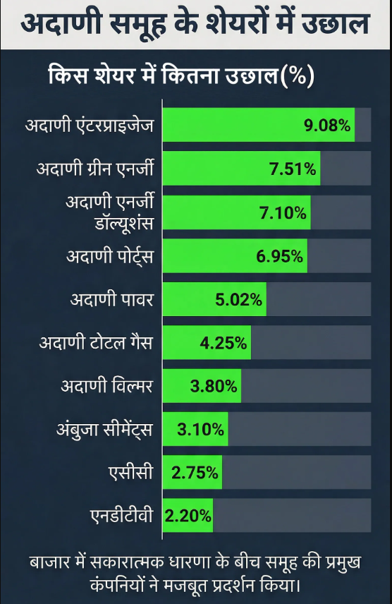 • अदाणी पोर्ट्स, अदाणी पावर, अंबुजा सीमेंट्स और अदाणी टोटल: 4% से ज्यादा की बढ़त।