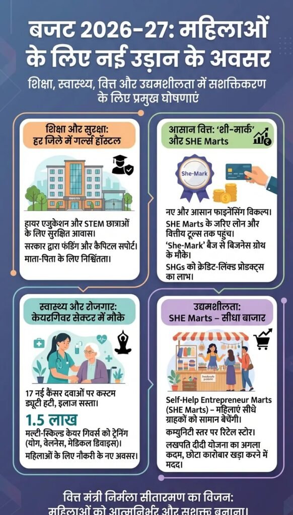 नई दिल्ली, 1 फरवरी 2026 – वित्त मंत्री निर्मला सीतारमण ने बजट 2026-27 में महिलाओं को सशक्त बनाने के लिए कई अहम घोषणाएं कीं। इस बार का बजट महिलाओं की शिक्षा, रोजगार और उद्यमिता को नई दिशा देने वाला माना जा रहा है। 1. हर जिले में गर्ल्स हॉस्टल STEM (Science, Technology, Engineering, Math) क्षेत्रों में पढ़ने वाली छात्राओं के लिए हर जिले में गर्ल्स हॉस्टल बनाए जाएंगे। इससे ग्रामीण और छोटे शहरों से आने वाली छात्राओं को सुरक्षित आवास मिलेगा और माता-पिता भी निश्चिंत होकर बेटियों को पढ़ाई के लिए भेज सकेंगे। 2. SHE Marts और She-Mark SHE Marts (Self-Help Entrepreneur Marts): महिलाओं को अपने उत्पाद सीधे ग्राहकों तक बेचने का प्लेटफॉर्म मिलेगा। यह लखपति दीदी योजना का विस्तार है, जिससे महिलाएं न सिर्फ कमाई करेंगी बल्कि अपना कारोबार भी खड़ा कर पाएंगी। She-Mark बैज: महिलाओं को फाइनेंस और बिज़नेस ग्रोथ से जुड़े अवसरों तक आसान पहुंच दिलाने के लिए नया बैज शुरू किया गया है। SHGs से जुड़ी महिलाओं को क्रेडिट-लिंक्ड प्रोडक्ट्स का फायदा मिलेगा। 3. आसान फाइनेंसिंग टूल्स महिलाओं के लिए नए और आसान लोन व फाइनेंसिंग ऑप्शन पेश किए गए हैं। इससे महिला उद्यमियों को अपने बिज़नेस को आगे बढ़ाने में मदद मिलेगी। 4. केयरगिवर सेक्टर में रोजगार सरकार 1.5 लाख मल्टी-स्किल्ड केयर गिवर्स को ट्रेनिंग देगी। ट्रेनिंग में देखभाल, योग, वेलनेस और मेडिकल डिवाइस से जुड़ी स्किल्स शामिल होंगी। इस सेक्टर में ज़्यादातर महिलाएं काम करती हैं, इसलिए इससे महिलाओं के लिए नए रोजगार अवसर खुलेंगे। 5. हेल्थ सेक्टर में राहत 17 नई कैंसर दवाओं पर कस्टम ड्यूटी हटाई गई, जिससे इलाज सस्ता होगा। इससे महिलाओं और परिवारों को सीधा फायदा मिलेगा। निष्कर्ष बजट 2026-27 महिलाओं को शिक्षा, रोजगार और उद्यमिता में आगे बढ़ाने का रोडमैप पेश करता है। गर्ल्स हॉस्टल, SHE Marts, She-Mark और केयरगिवर सेक्टर में रोजगार जैसे कदम महिलाओं को आर्थिक और सामाजिक रूप से सशक्त बनाने की दिशा में अहम साबित होंगे। FacebookShare on XLinkedInWhatsAppEmailCopy Link Post navigation कभी नरम, कभी गरम: ट्रंप की भारत नीति की टाइमलाइन CBSE Admit Card 2026: 10वीं-12वीं के एडमिट कार्ड जारी, छात्रों को सीधे डाउनलोड की अनुमति नहीं